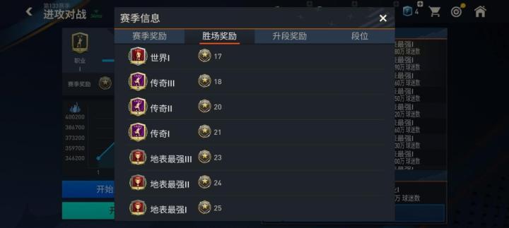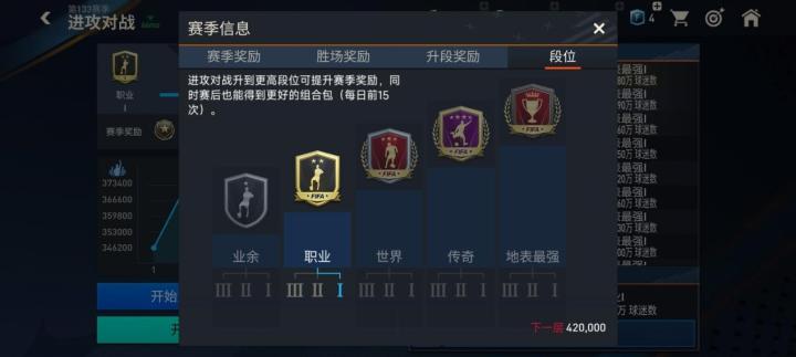 进攻对战模式是游戏早期就有的两大对战模式之一。该模式的段位划分与实时对战和经理人模式类似,分为了业余、职业、世界、传奇、地表最强五个大段位,每个大段位又根据具体的奖杯数量不同,分为三个小段位。