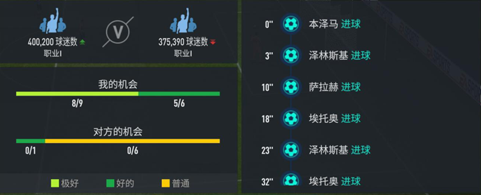 当玩家的球队总评高于对手时,系统判定的好机会、尚可的机会都会越多。反之,当玩家的球队总评低于对手时,系统判定的好机会、尚可的机会都会越少,普通的机会会越多。在该模式中,玩家的球队总评越高,获胜的机会也就越大。