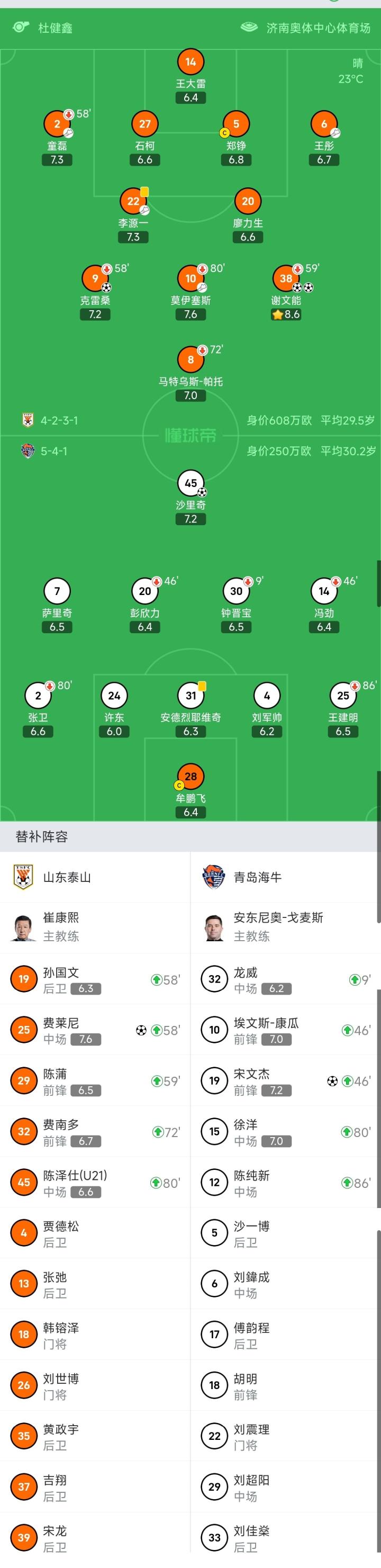 北京时间9月15日19:35,中超第25轮,齐鲁德比在济南奥体中心打响,山东泰山主场对阵青岛海牛。本场比赛主裁判是杜健鑫,VAR是麦麦提江。上半场童磊直塞送出助攻,谢文能攻破旧主球门并收获个人中超处子球,随后王彤将球回做送出助攻,谢文能推射远角破门完成双响,之后莫伊塞斯长传送出助攻,安德烈耶维奇解围没能碰到球,克雷桑禁区外轻巧挑射建功。下半场康瓜送出助攻,沙里奇低射破门扳回一球,随后李源一助攻费莱尼推射破门,之后徐洋送出助攻,宋文杰攻破旧主球门扳回一球。全场结束,山东4-2双杀海牛。