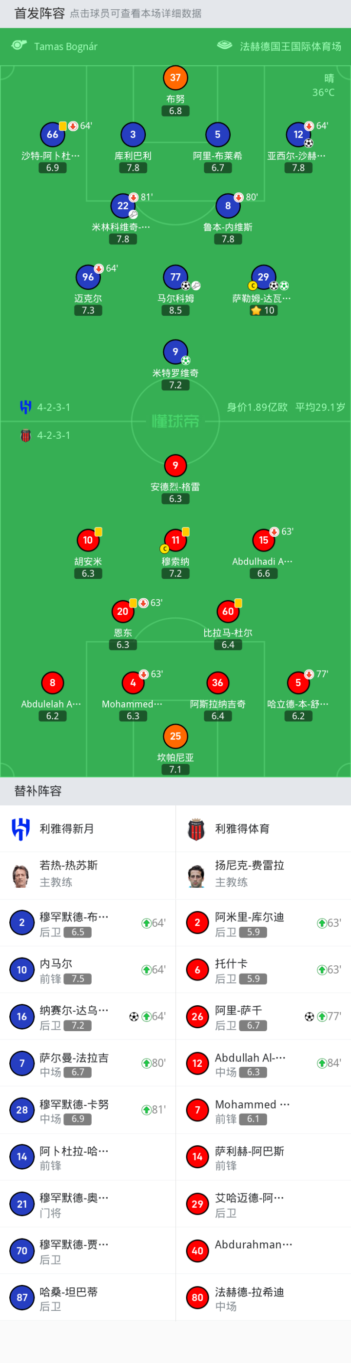 利雅得新月首发:3-库利巴利, 12-亚西尔-沙赫拉尼, 37-布努, 29-萨勒姆-达瓦萨里, 9-米特罗维奇, 8-鲁本-内维斯, 22-米林科维奇-萨维奇, 77-马尔科姆, 5-阿里-布莱希, 96-迈克尔, 66-沙特-阿卜杜勒哈米德