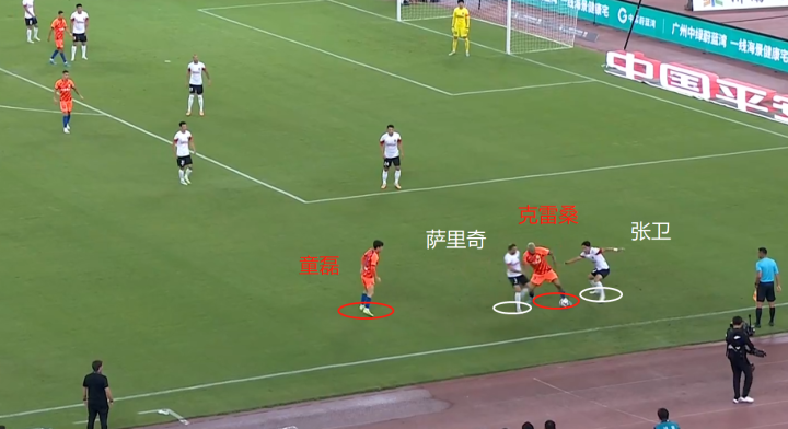 (图)即便不换位,克雷桑也可以在边路轻松打爆张卫,萨里奇必须前来协防,使得童磊无人顾及,中路的彭欣力、龙威也得不到萨里奇的策应