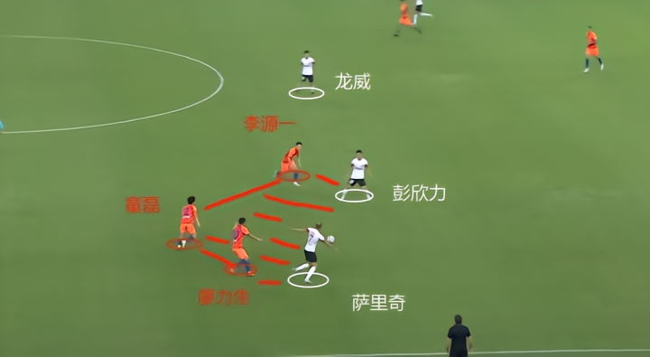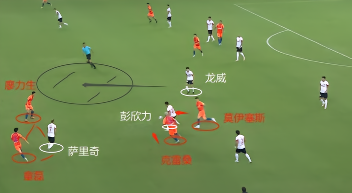 (图)彭欣力拿球瞬间,身后克雷桑与莫伊塞斯立刻反抢,试图接应的萨里奇也被童磊与廖力生包夹,龙威本可以前压到空当位置接球(黑箭),但他依然选择原地看球