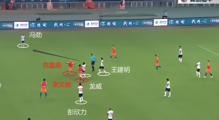 (图)龙威在本方半场拿球后立刻被包夹,龙威慌乱下没能传球给冯劲(黑箭),被克雷桑瞬间抢断打成反击,这种禁区前三十米区域内的丢球失误是足以致命的