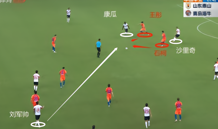 (图)刘军帅在边路送出斜传,泰山中后卫石柯头脑发热直冲皮球而去,康瓜反身把球做给无人盯防的沙里奇,制造了海牛的第一粒入球