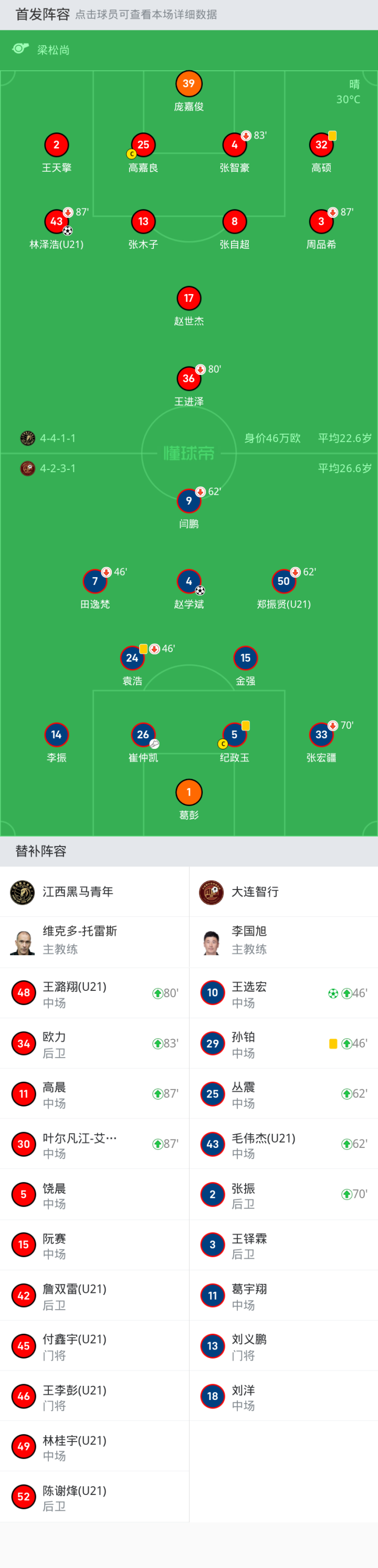 替换下场:70'33-张宏疆, 62'9-闫鹏, 46'24-袁浩, 46'7-田逸梵, 62'50-郑振贤(U21)
