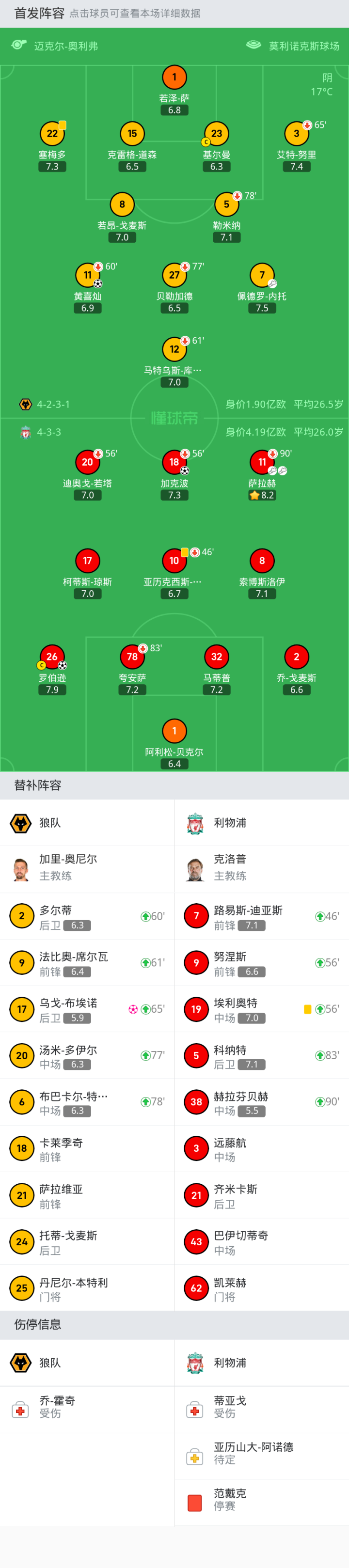 北京时间9月16日晚间19:30,英超联赛第5轮,利物浦做客莫利诺克斯球场挑战狼队,本场比赛主裁判为迈克尔-奥利弗。上半场狼队黄喜灿破门,库尼亚头球起跳过早错失良机,加克波射门踢疵。下半场,利物浦萨拉赫上演助攻梅开二度,加克波和罗伯逊先后破门,乌戈-布埃诺自摆乌龙。最终比分1-3。
