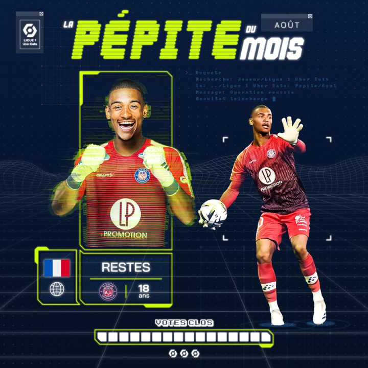 法甲官方宣布,图卢兹门将雷斯特当选法甲8月最佳新秀,本赛季是他的职业生涯首个赛季。