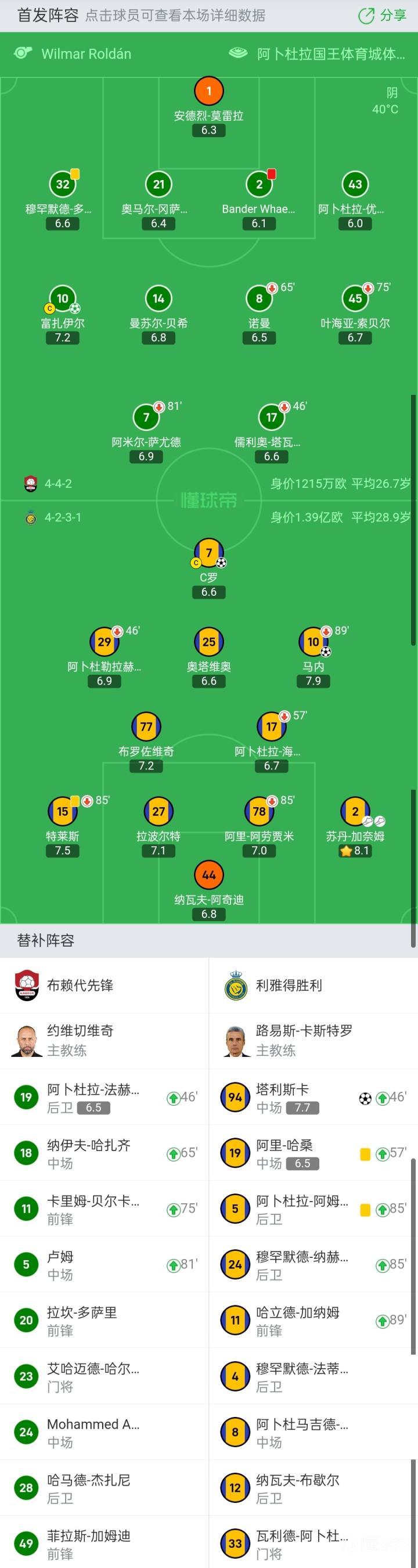 利雅得胜利首发:44-纳瓦夫-阿奇迪、2-苏丹-加奈姆、78-阿里-阿劳贾米、27-拉波尔特、15-特莱斯、17-阿卜杜拉-海巴里、77-布罗佐维奇、10-马内、25-奥塔维奥、29-阿卜杜勒拉赫曼-加里卜、7-C罗