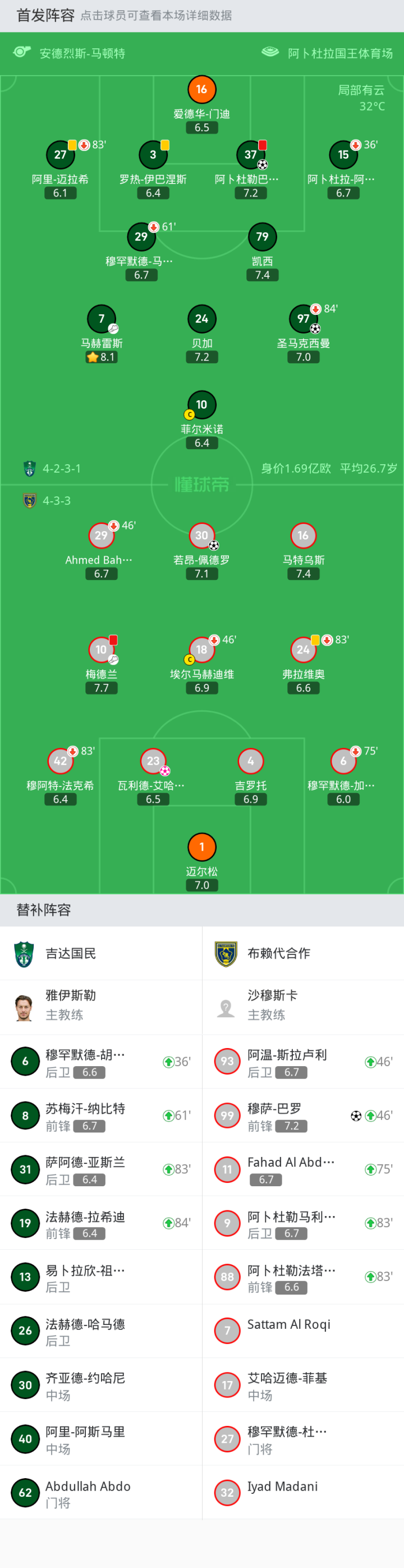 替换下场:46'18-埃尔马赫迪维, 83'24-弗拉维奥, 75'6-穆罕默德-加姆迪, 46'29-Ahmed Bahusayn, 83'42-穆阿特-法克希
