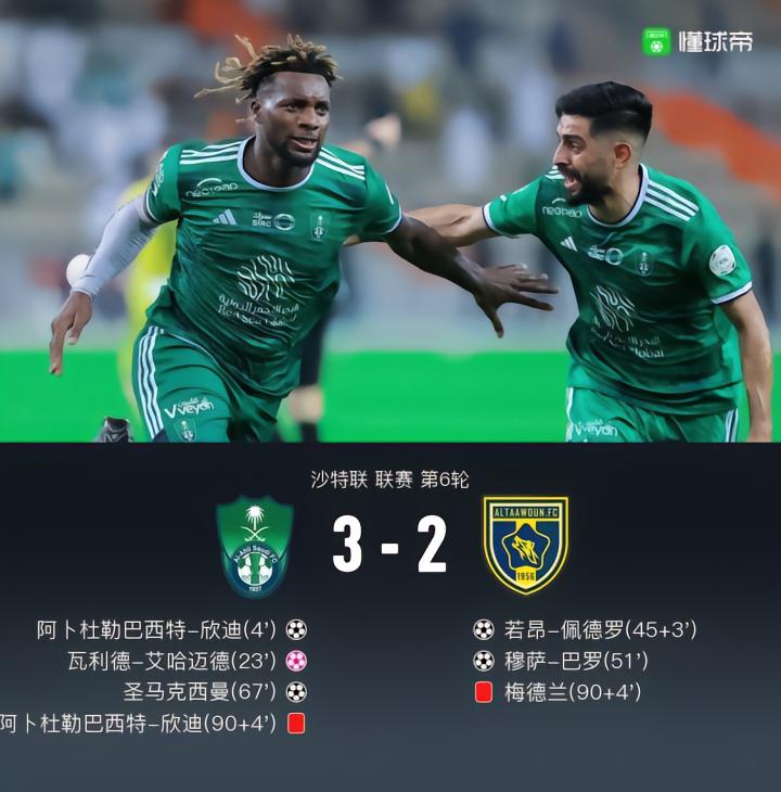 第4分钟,马赫雷斯任意球送出助攻,欣迪头槌破门,吉达国民1-0。
