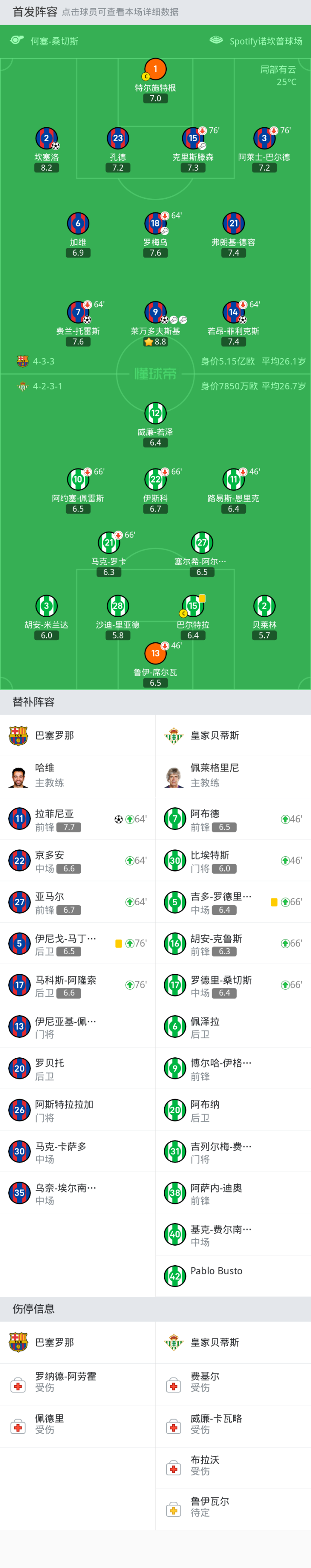 皇家贝蒂斯首发:12-威廉-若泽, 22-伊斯科, 15-巴尔特拉, 2-贝莱林, 13-鲁伊-席尔瓦, 10-阿约塞-佩雷斯, 21-马克-罗卡, 3-胡安-米兰达, 11-路易斯-恩里克, 27-塞尔希-阿尔蒂米拉, 28-沙迪-里亚德