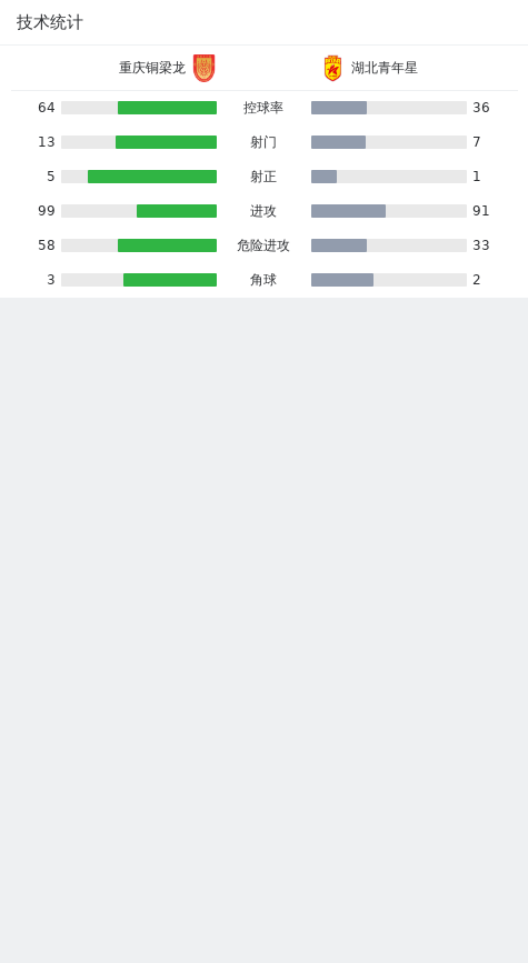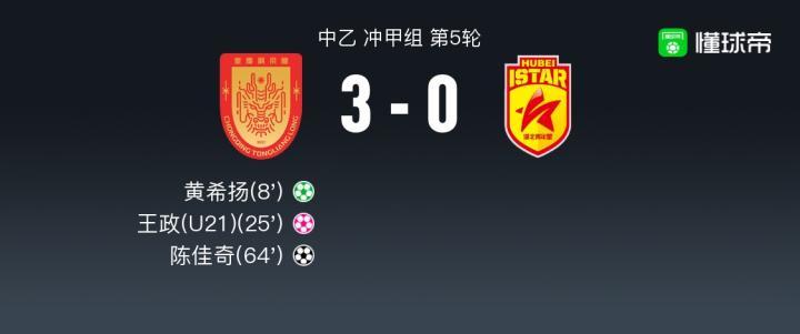 北京时间9月17日中乙 冲甲组 第5轮,重庆铜梁龙主场对阵湖北青年星。黄希扬和陈佳奇破门,王政自摆乌龙,最终重庆铜梁龙以3-0战胜湖北青年星。