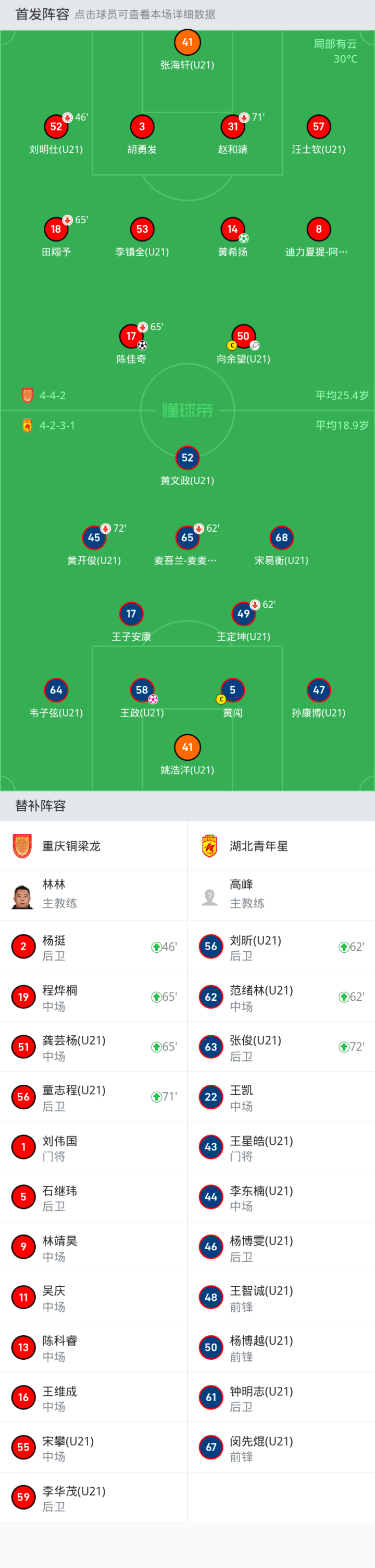 替换下场:71'31-赵和靖, 65'17-陈佳奇, 46'52-刘明仕(U21), 65'18-田翔予