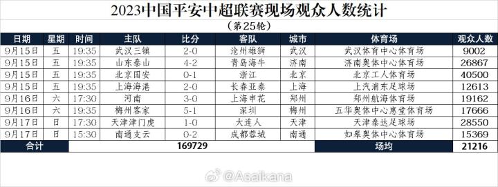 中超第25轮现场观众:工体40500人最多,津门虎vs大连28550人ETChalmers @懂球帝2023-09-17 21:19中超第25轮8场比赛结束,本轮现场观众人数统计出炉,北京国安vs浙江40500人最多,天津津门虎vs大连人28550人,场均21216人。中超第25轮现场观众人数武汉三镇vs沧州雄狮 9002人山东泰山vs青岛海牛 26867人北京国安vs浙江 40500人上海海港vs长春亚泰 12613人河南vs上海申花 19162人梅州客家vs深圳 17666人天津津门虎vs大连人 28550人南通支云vs成都蓉城 15369人数据来源:@Asaikana 展开更多