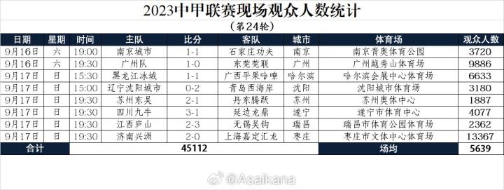 中甲第24轮上座人数:济南主场13367人领跑,广州主场9886人德鲁飞鱼2023-09-17 23:35中甲联赛第24轮战罢,德转中国区管理员朱艺统计了各场次的上座人数,八场比赛场均观众5639人。图源德转中国区管理员@Asaikana各场次详细上座人数南京城市1-1石家庄功夫,3720人广州1-0东莞莞联,9886人黑龙江冰城1-1广西平果哈嘹,6633人辽宁沈阳城市0-2青岛西海岸,3180人苏州东吴2-1丹东腾跃,1887人四川九牛3-1延边龙鼎,4077人江西庐山2-3无锡吴钩,2362人济南兴洲2-0上海嘉定汇龙,13367人展开更多