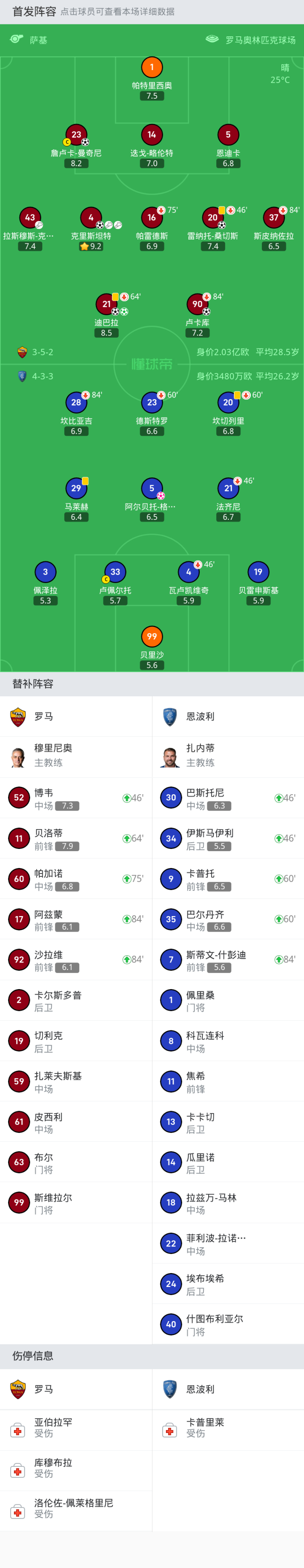 罗马首发:1-帕特里西奥, 90-卢卡库, 16-帕雷德斯, 37-斯皮纳佐拉, 21-迪巴拉, 4-克里斯坦特, 14-迭戈-略伦特, 20-雷纳托-桑切斯, 23-詹卢卡-曼奇尼, 43-拉斯穆斯-克里斯滕森, 5-恩迪卡