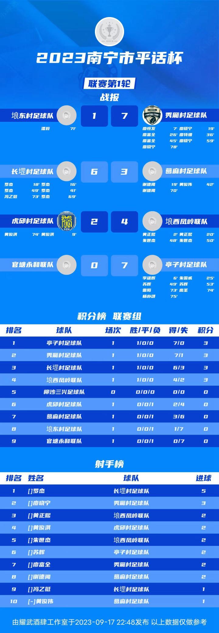 其他的比赛秀厢村7-1击败埌东村,琅西凤岭联队4-2战胜虎邱村,官塘永和联队0-7不敌亭子村,柳沙三兴足球队轮空。首轮比赛攻入30球,场均7.5球。