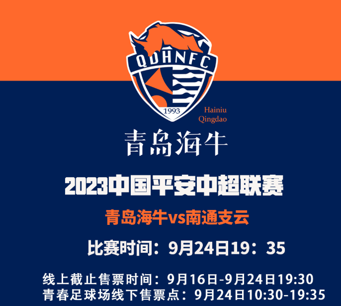 9月24日(星期天)19:35,在2023赛季中超联赛第26轮的一场关键对决中,青岛海牛将坐镇主场青岛青春足球场,迎战同为升班马的南通支云。赛前,青岛海牛足球俱乐部早早发布了这场比赛的票务公告。