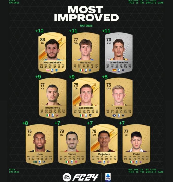 FC24意甲能力值进步最大的10名球员分别为: