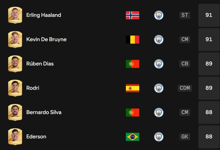 FC24曼城球员能力值:哈兰德、德布劳内91,小蜘蛛80,多库77