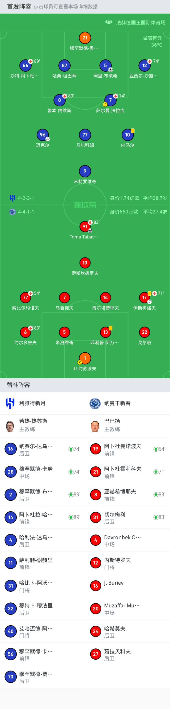 上场替补:71'21-阿卜杜霍利科夫, 83'8-亚赫希博耶夫, 54'19-阿卜杜曼诺波夫, 83'31-切尔梅利