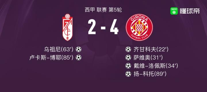 北京时间9月19日西甲 联赛 第5轮,格拉纳达主场对阵赫罗纳。格拉纳达乌祖尼破门,卢卡斯-博耶破门。赫罗纳齐甘科夫破门,萨维奥破门,戴维-洛佩斯破门,扬-科托破门。最终比分2-4。