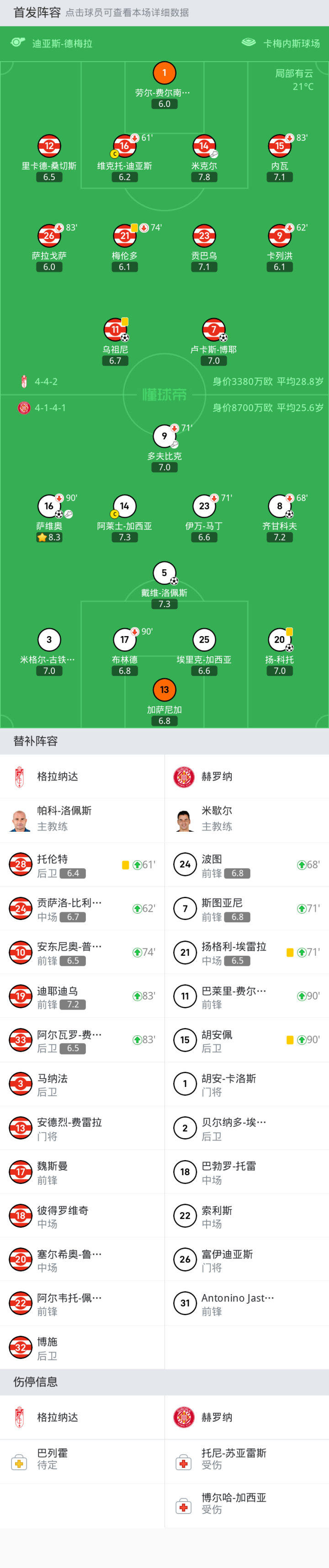 格拉纳达首发:1-劳尔-费尔南德斯, 9-卡列洪, 16-维克托-迪亚斯, 14-米克尔, 23-贡巴乌, 11-乌祖尼, 7-卢卡斯-博耶, 15-内瓦, 21-梅伦多, 12-里卡德-桑切斯, 26-萨拉戈萨