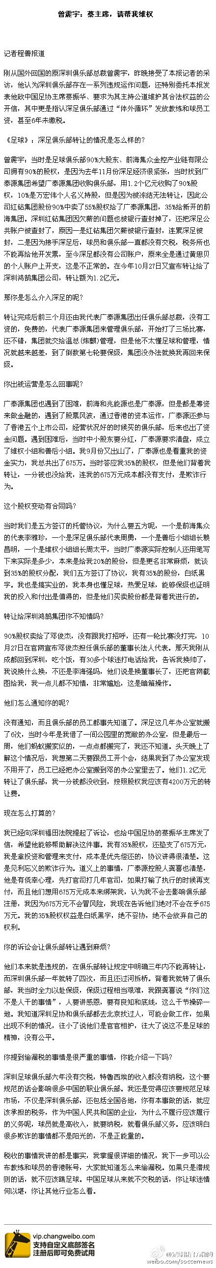 程文莉写道:你们还记得深圳宇恒么?就是2015赛季的深足,还记得一个名叫曾震宇的总裁么?还记得2015年,命运多舛的深足度过了队史最混乱最荒唐的一个赛季么?各种离谱事件层出不穷,剧情相当狗血。今天提到他,是因为得知了他也步皮特-渣(深足总经理丁勇)后尘的消息。