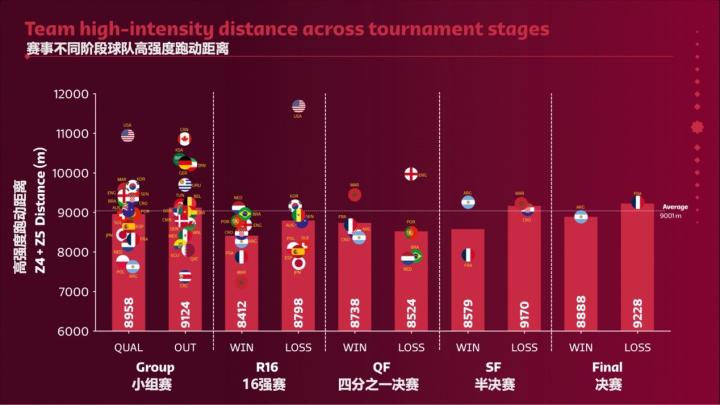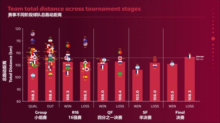 表4 2022年卡塔尔世界杯上球队在世界杯各阶段的总跑动距离。数据以90分钟常规时间和伤停补时阶段为标准(不包括加时赛)