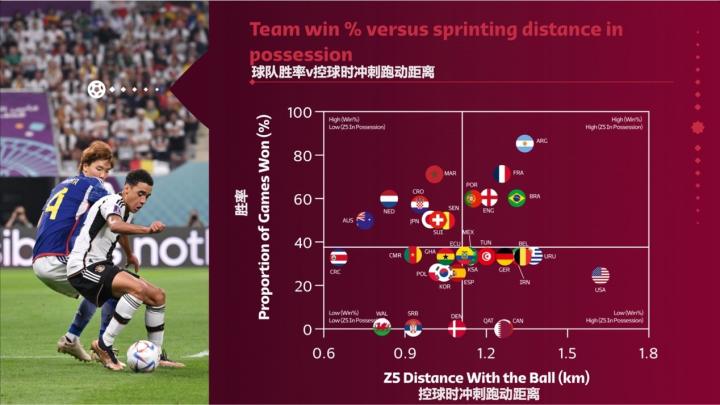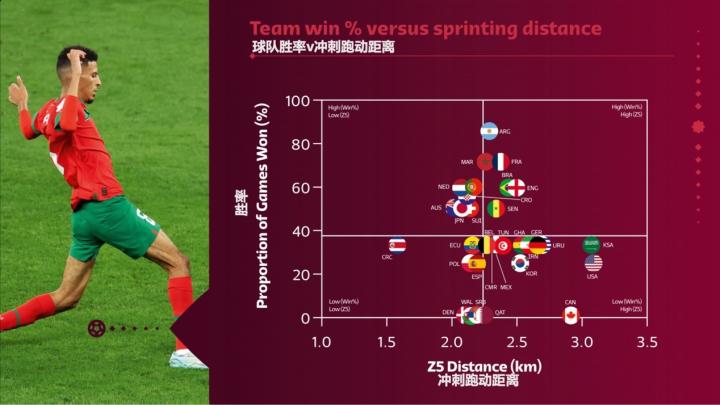 在2022年卡塔尔世界杯上,体能指标和球队获得的胜率之间不存在关联。然而,8支四分之一决赛球队中有5支(阿根廷、法国、巴西、英格兰和葡萄牙)控球阶段冲刺跑动的距离较长。