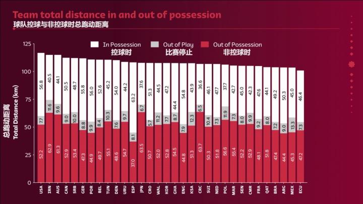 世界杯球队跑动分析:西班牙控球时跑动最多,日本非控球最多