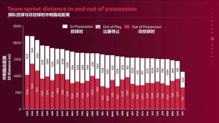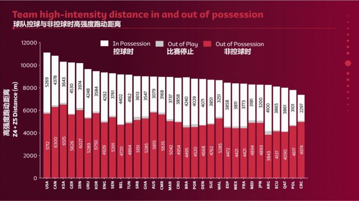 西班牙队在控球阶段跑动的总距离最多,哥斯达黎加队和日本队等球队在非控球阶段的跑动距离最多。与此同时,美国队控球阶段高强度跑动的距离最多,而沙特阿拉伯队在非控球阶段高强度跑动的距离最多。