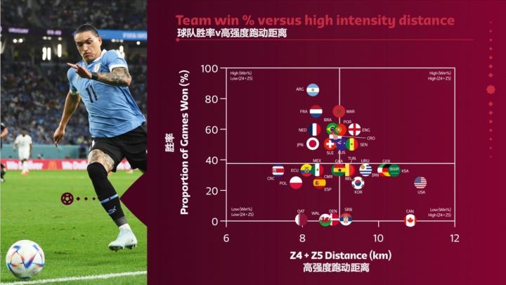 表8 2022年卡塔尔世界杯上球队胜率相对于高强度的跑动距离。数据以90分钟常规时间和伤停补时阶段为标准(不包括加时赛)