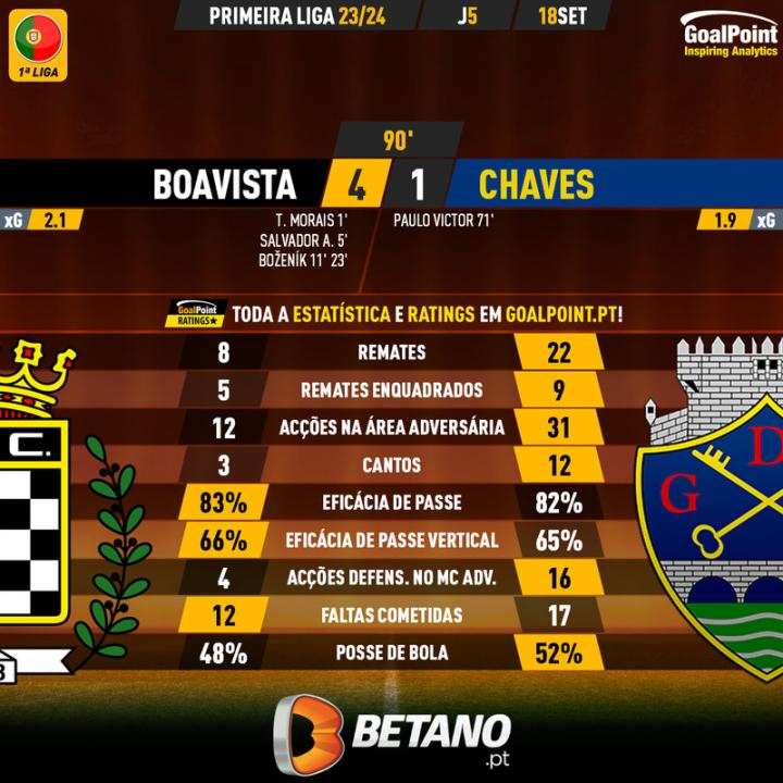 葡超联赛资讯葡超第5轮,博阿维斯塔在贝萨球场迎来沙维斯,他们在30分钟前打进4球早早锁定胜局,沙维斯在下半场由保罗-维克托打进一球挽回颜面,本场比赛过后,沙维斯积0分继续排名垫底,而博阿维斯塔高歌猛进5轮拿下13分位列榜首。