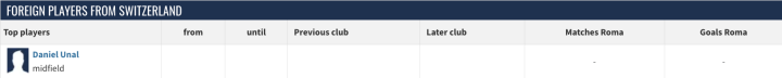 虽然瑞士出产很很多球星,但罗马历史上的球星却屈指可数,有记录的显示,只有一名司职中场的丹尼尔·尤纳尔(Daniel Unal)的从贝林佐纳(AC Bellinzona)租借至罗马U19青年队,并在U19青年队出场26场,2153分钟(场均82.81分钟),打入5球并有1个助攻!并被时任主帅斯帕莱蒂提拔至一线队5场(含3次意甲联赛以及2次意大利杯),但均坐在板凳席未有出场!