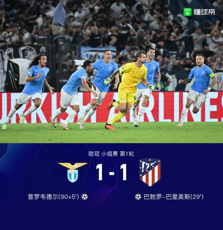 北京时间9月20日3:00,欧冠小组赛第1轮,拉齐奥主场对阵马德里竞技。上半场,扎卡尼任意球攻门被扑出,巴勃罗-巴里奥斯折射破门。下半场补时阶段,拉齐奥门将普罗韦德尔读秒头球绝平,最终,拉齐奥主场1-1战平马竞。