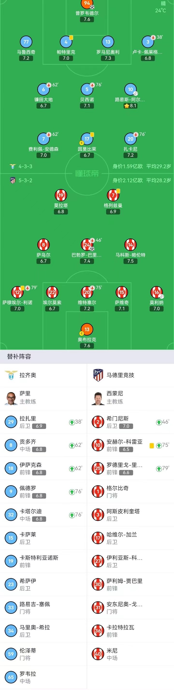 拉齐奥首发:17-因莫比莱, 5-贝西诺, 10-路易斯-阿尔贝托, 7-费利佩-安德森, 4-帕特里克, 13-罗马尼奥利, 77-马鲁西奇, 20-扎卡尼, 94-普罗韦德尔, 6-镰田大地, 3-卢卡-佩莱格里尼