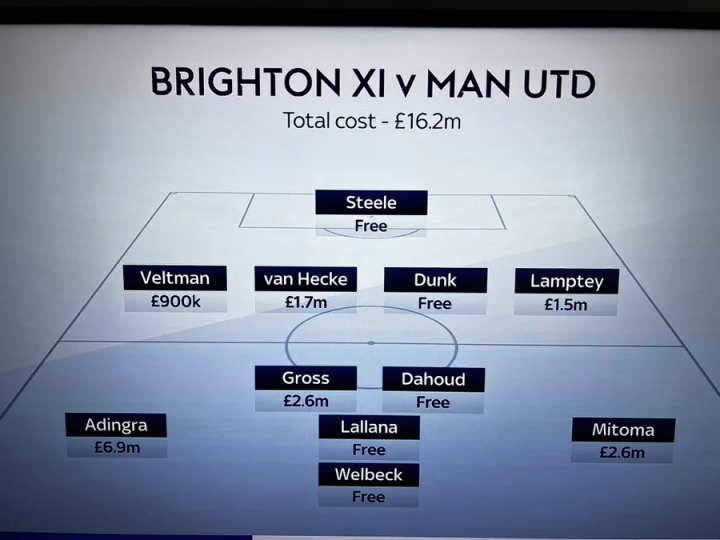 对阵曼联的比赛,布莱顿所有首发球员的转会费加总只有1620万英镑