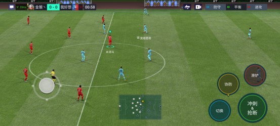 如上图所示,当玩家处于防守状态时右下方的四个按钮分别为【切换球员】、【协防】、【滑铲】、【冲刺&抢断】,其中,【协防】按键下滑可以呼叫门将出击。