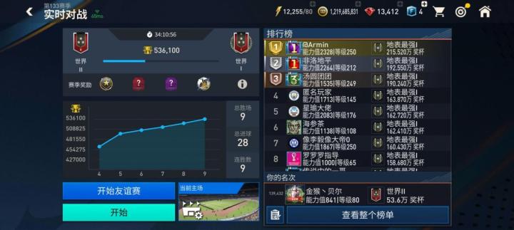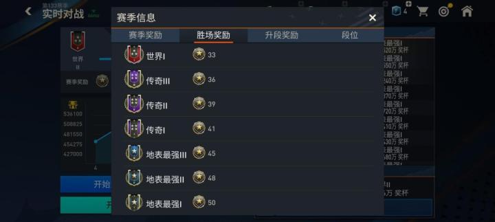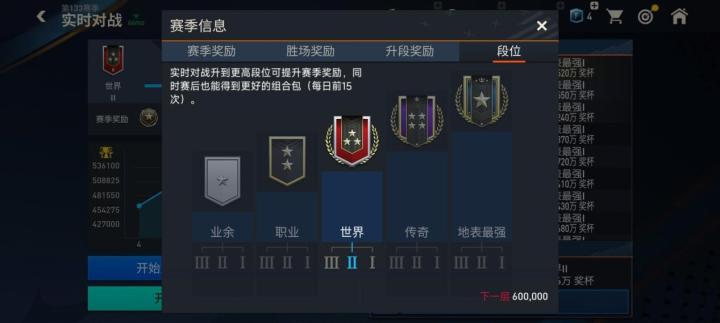 实时对战模式的段位划分与进攻对战和经理人模式类似,分为了业余、职业、世界、传奇、地表最强五个大段位,每个大段位又根据具体的奖杯数量不同,分为三个小段位。玩家所属段位越高,匹配到的对手水平也会越高。