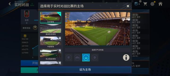 实时对战模式中,玩家可以选择自己用于实时对战比赛的主场,点击下方的【当前主场】按钮,即可进入场景选择界面,选择自己已经解锁的主场场景,调整不同天气和时段,设置完成后,点击【设为主场】,即可启用该主场场景。