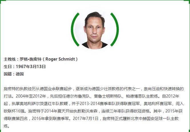 新的国安一线队教练团队共有11名成员,囊括了主教练、领队、助理教练、队医、心理教练、体能教练、守门员教练、技术分析师、理疗师等多个职位。国安俱乐部官方写道:随着德籍主教练罗格-施密特走马上任,北京中赫国安队正式进入新时代。按照俱乐部长期发展目标与规划,施密特将率领国际化团队,在先进足球理念的指导下,帮助俱乐部打好竞训基础、搭建青训体系、完善运动支持和保障体系,将北京中赫国安打造成具有重要影响力的国际化俱乐部。
