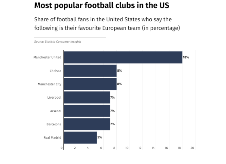 尽管曼联近来并未取得太多的荣誉,但该俱乐部已经在北美大陆建立了庞大的粉丝基础。据Statista消费者调查统计,当美国球迷被问及他们最喜欢欧洲五大联赛中的哪支球队时,18%的人选择了十三次英超冠军曼联。