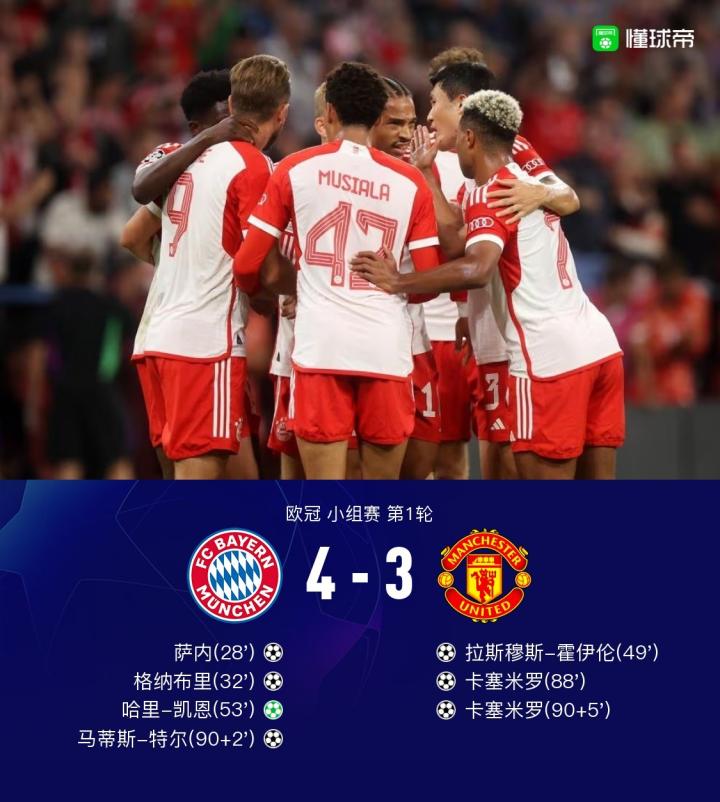 拜仁4-3曼联,凯恩传射卡塞米罗双响霍伊伦首球,奥纳纳失误