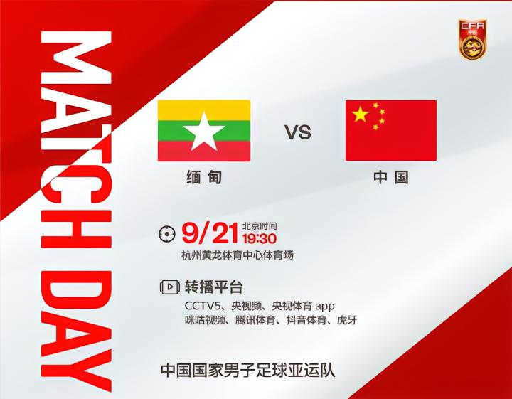 北京时间9月21日19:30,在杭州亚运会男足A组小组赛第二轮中,中国男足亚运队将继续坐镇黄龙体育中心体育场,迎战缅甸队。