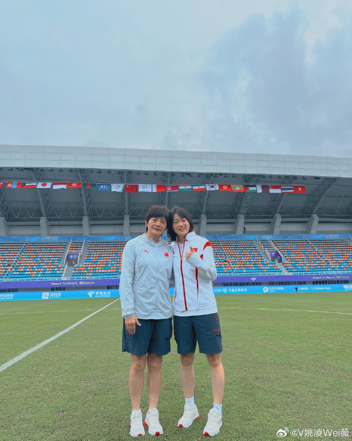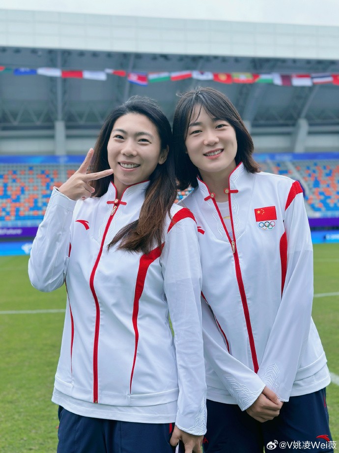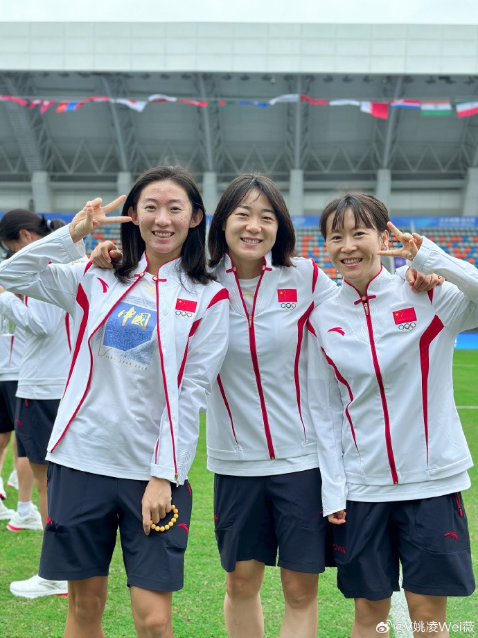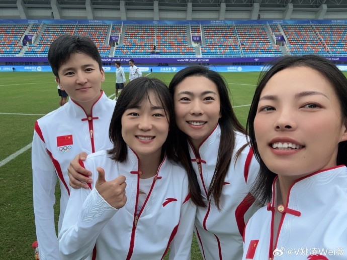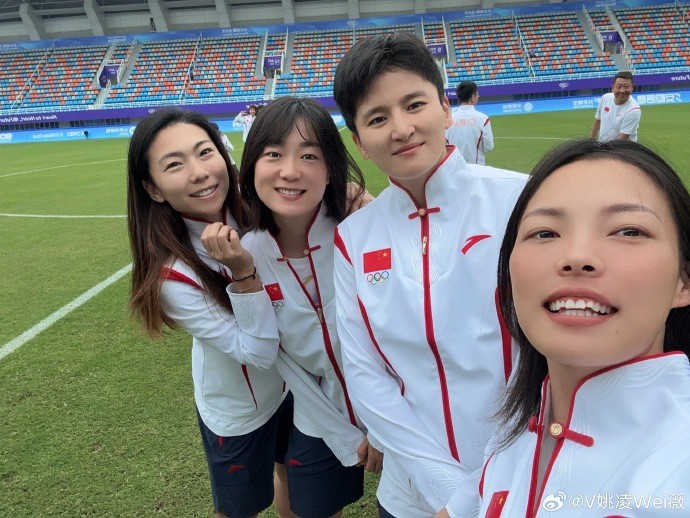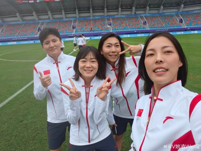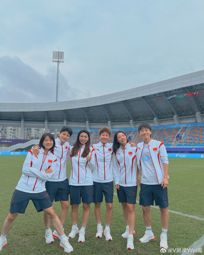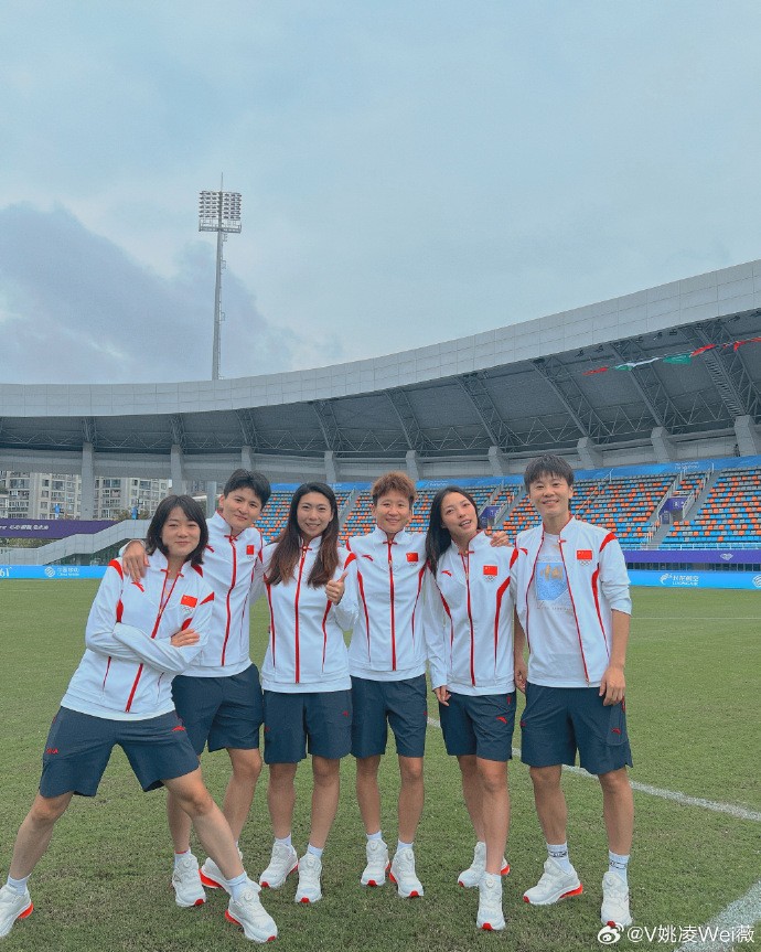姚凌薇与队友身着亚运会中国代表团服装合照