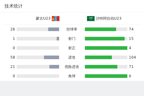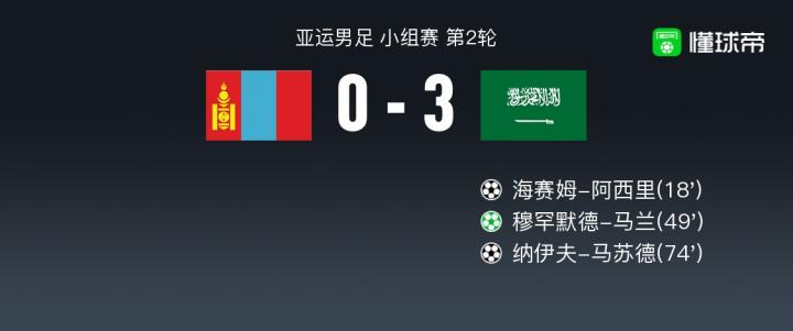 北京时间9月21日亚运男足 小组赛 第2轮,蒙古U23主场对阵沙特阿拉伯U23。沙特阿拉伯U23海赛姆-阿西里破门,纳伊夫-马苏德破门,穆罕默德-马兰破门。最终比分0-3。