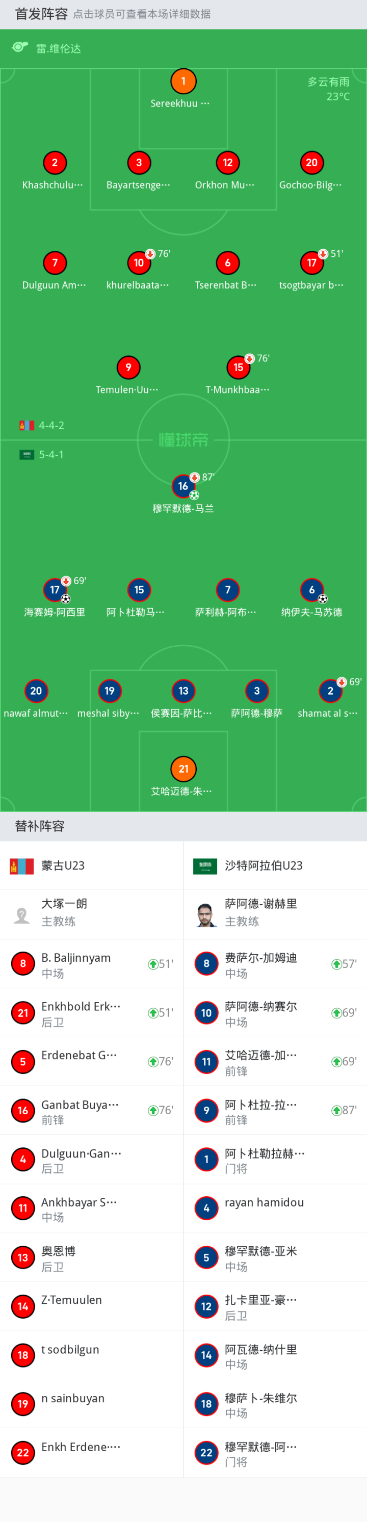 蒙古U23首发:12-Orkhon Munkh-Orgil, 7-Dulguun Amaraa, 10-khurelbaataryn ayush tsend, 1-Sereekhuu Batmagnai, 3-Bayartsengel Purevdorj, 6-Tserenbat Baasanjav, 2-Khashchuluun Naranbaatar, 15-T·Munkhbaatar, 17-tsogtbayar batbayar, 20-Gochoo·Bilguun, 9-Temulen·Uuganbat