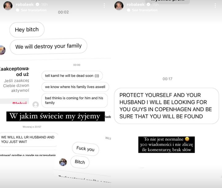 格拉巴拉的女友多米妮卡-罗巴克晒出了自己收到的部分私信,内容包括:“我们会摧毁你的家庭”、“告诉卡米尔他很快就会死,我们也知道他家人住哪”、“我们会杀了你的丈夫和你,等着吧”以及“保护好你和你丈夫,我会在哥本哈根找你们,并且一定会找到”。