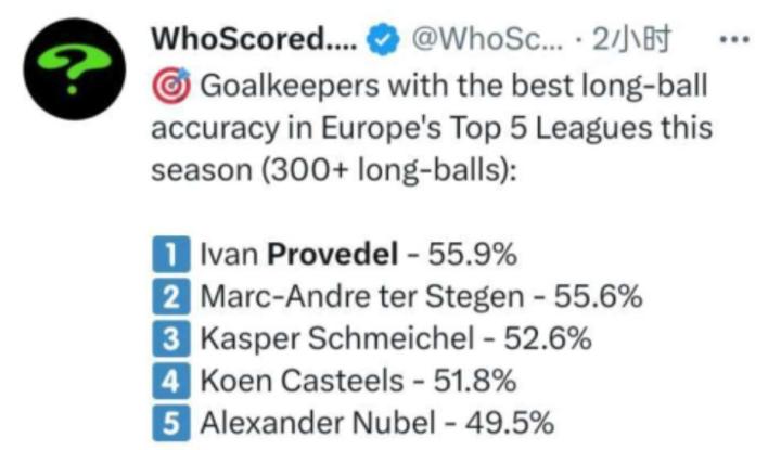 甚至他的传球功力也是所有门将里最好的:他的长传成功率排在五大联赛排第一。